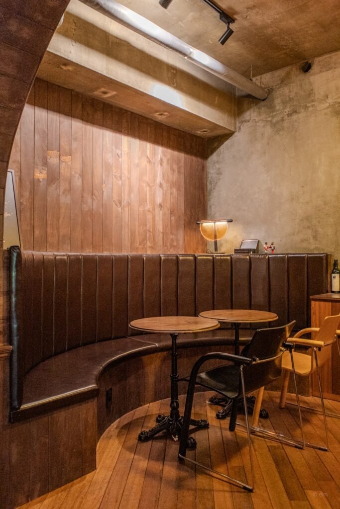 Past the main floor, a carved wooden arch — detailed with ornate millwork along the crown — opens into a semi-private alcove. The walls here transition from dark wood paneling to raw plaster, aged and unfinished. A curved dark brown leather banquette wraps the room in a horseshoe, tufted in vertical channels. It seats six comfortably and feels like exactly where you’d want to have a long conversation or a slow solo afternoon with a book. The light here is warmer, quieter. The architecture does the work.