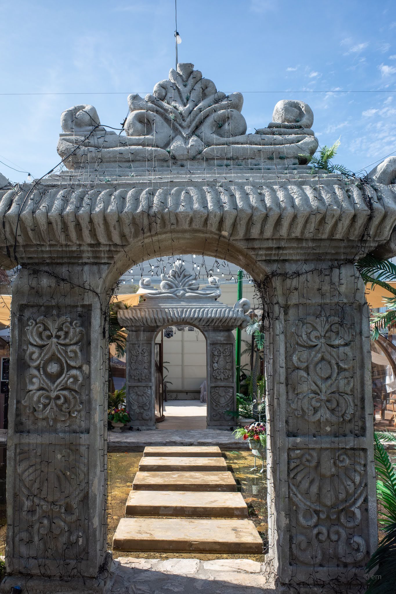 The entrance arch sets the register for everything that follows. It’s the kind of gate that belongs in front of a temple on another island, in another climate — a dense composition of carved relief panels, scrolling finials, and layered eaves, strung with fairy lights that must do considerable work at night. Stepping through it, you cross into the courtyard with the mild surprise of someone who expected a café and has instead stumbled into a film set for a story set somewhere else entirely.