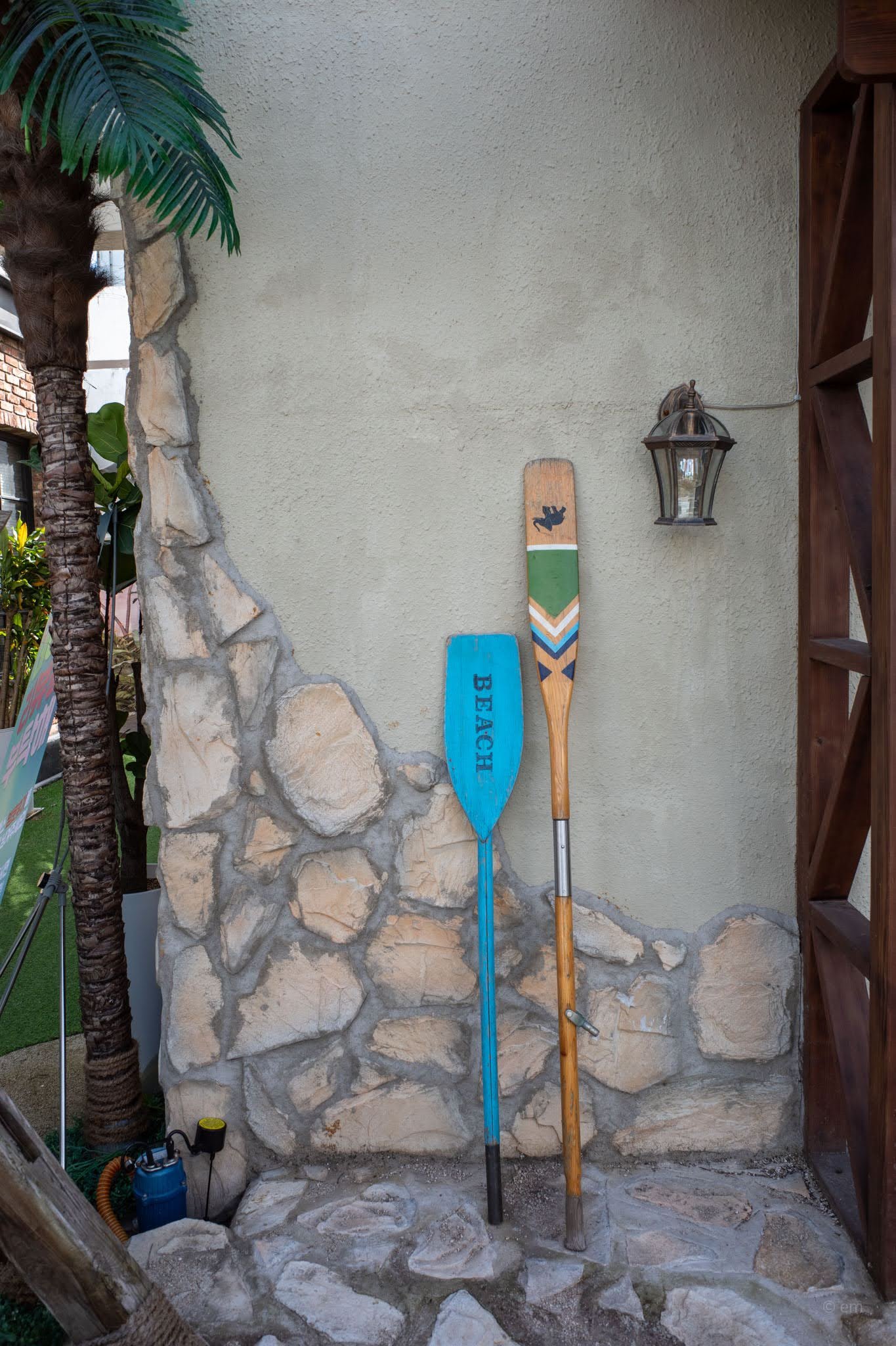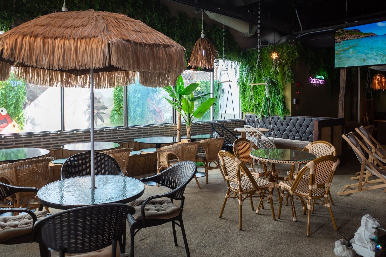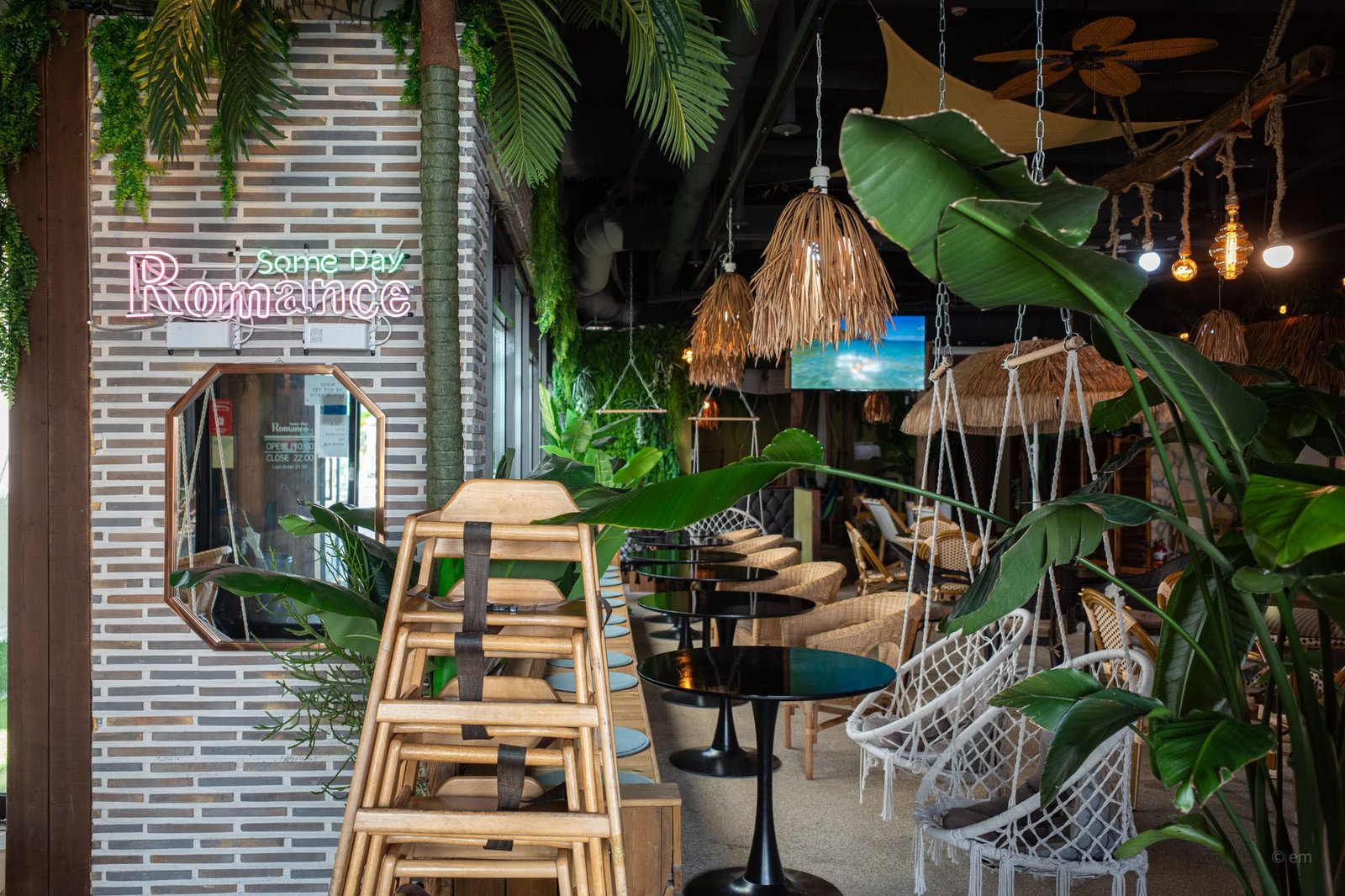 A neon sign on the brick wall — Some Day Romance, in alternating pink and green — marks the interior’s social center of gravity. The sign shows up in nearly every angle of the room, reflected in an octagonal mirror beside it, doubling itself. The chairs here are woven bistro style; the pendant lights are thatched; the walls are tropical green and exposed brick, layered together in a way that shouldn’t cohere but does. A flat screen on the wall plays looping ocean footage, in case the point needed reinforcing.