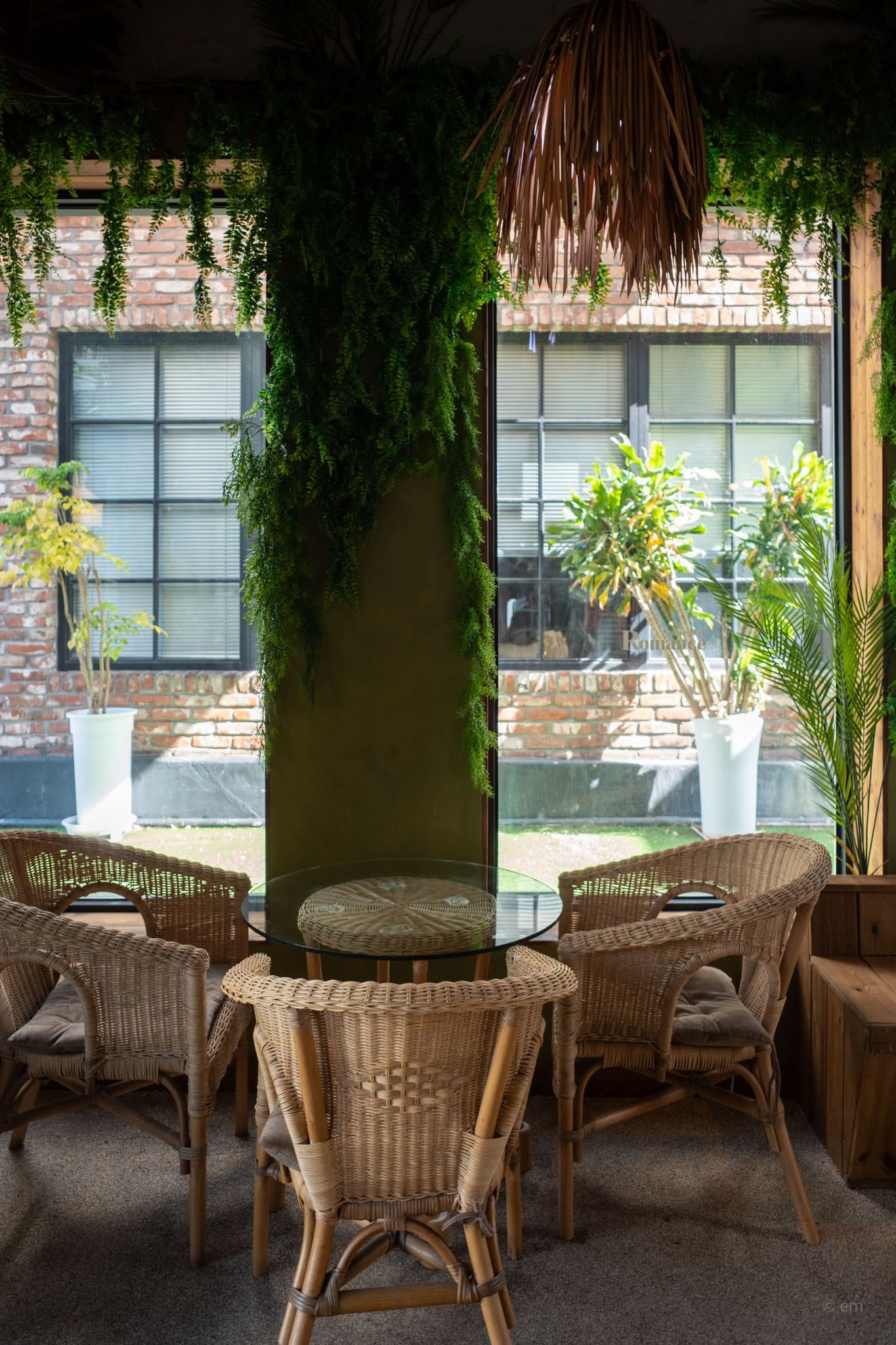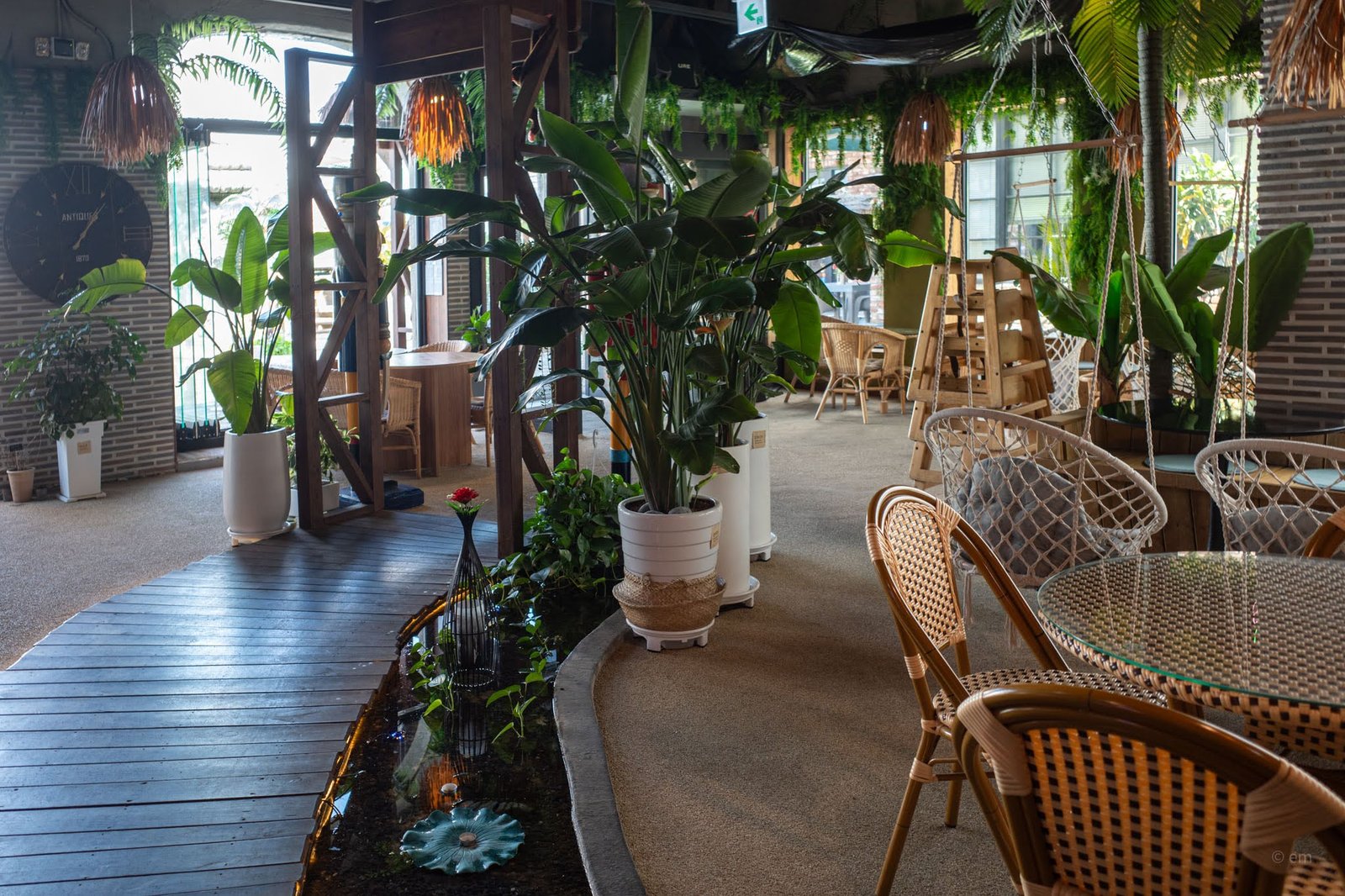 The indoor sections translate the same energy through different materials. One zone reads as a greenhouse café — wooden boardwalk paths cutting through dense arrangements of banana leaf plants and tropical specimens, pendant lights woven from natural fiber hanging above rattan seating. The floor-level stream running under the walkway is a quiet theatrical touch, audible underfoot if you stop to listen. Hanging macramé egg chairs appear throughout, suspended from overhead frames, suited to the general proposition that you might as well settle in and stay.