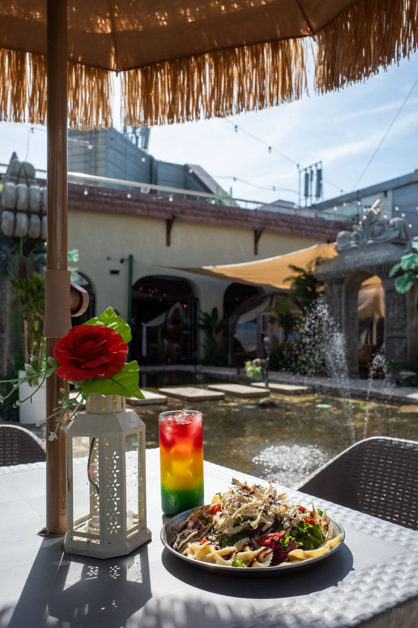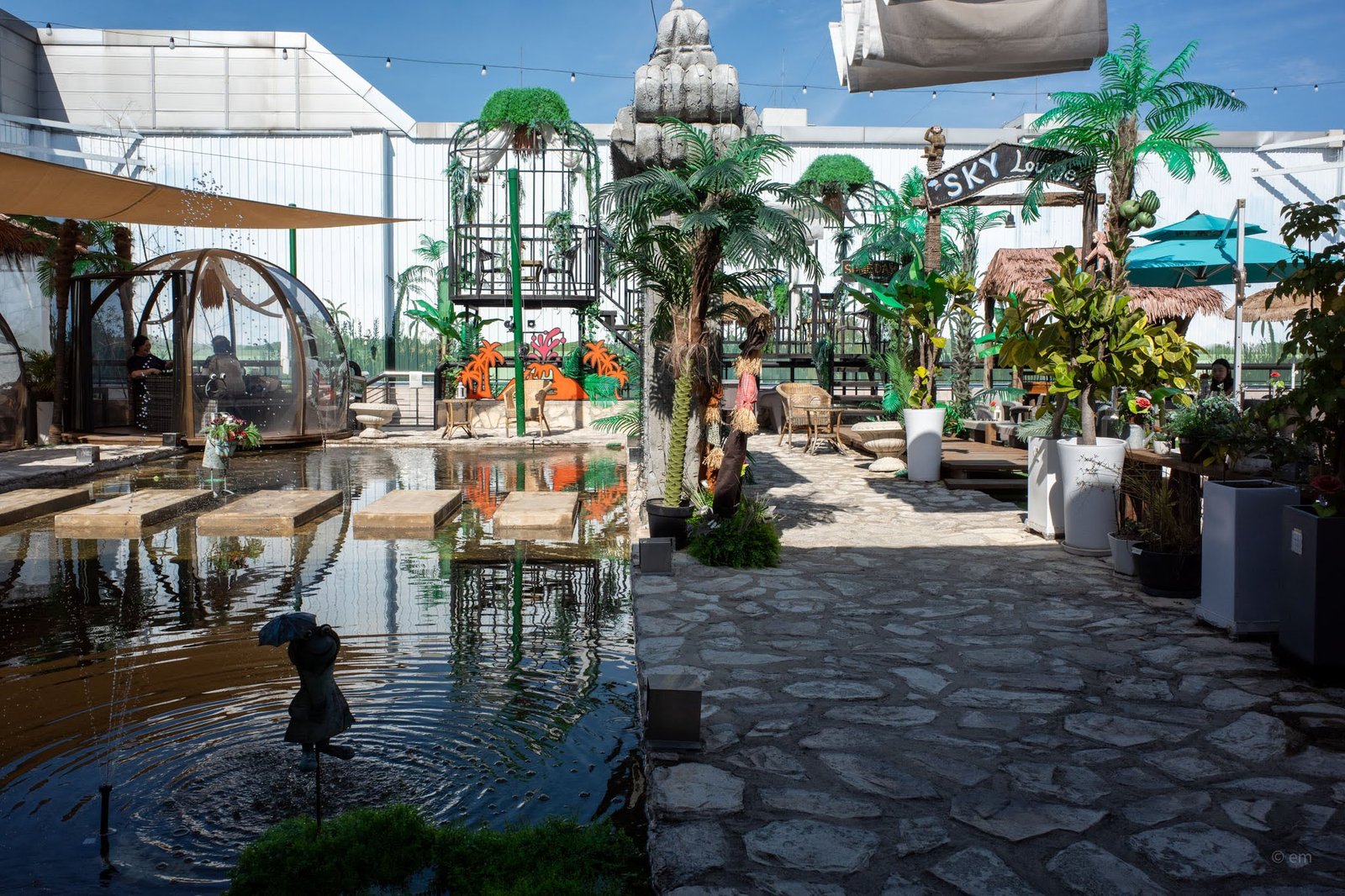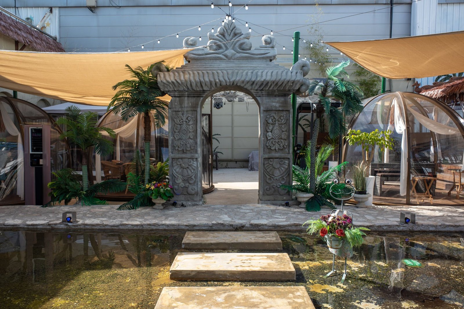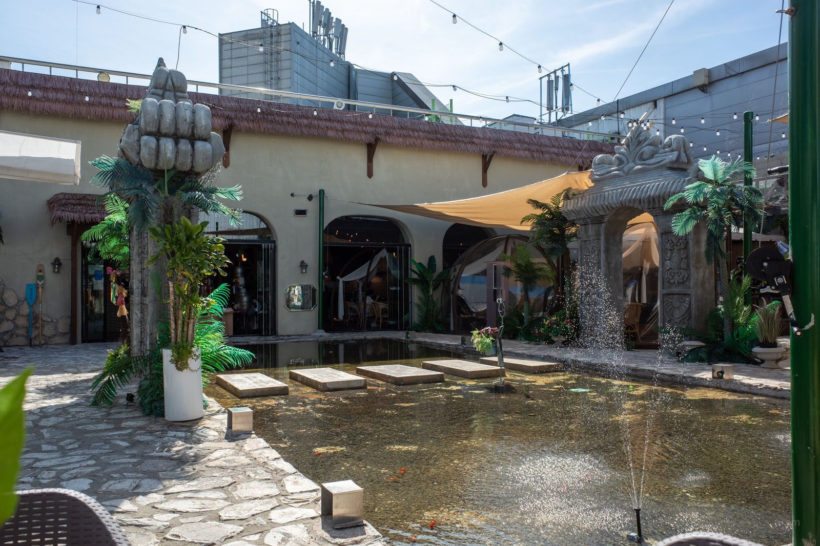Someday Romance doesn’t ease you in. Before you find your table, before you touch a menu, you pass through a carved stone gate — ornate, moss-grey, elaborately detailed in what reads as Balinese temple architecture — and descend toward a reflecting pond where fountains pulse and stepping stones bridge the water. Palm trees, real and artificial, crowd the edges. The city is somewhere below. It has been left behind.
