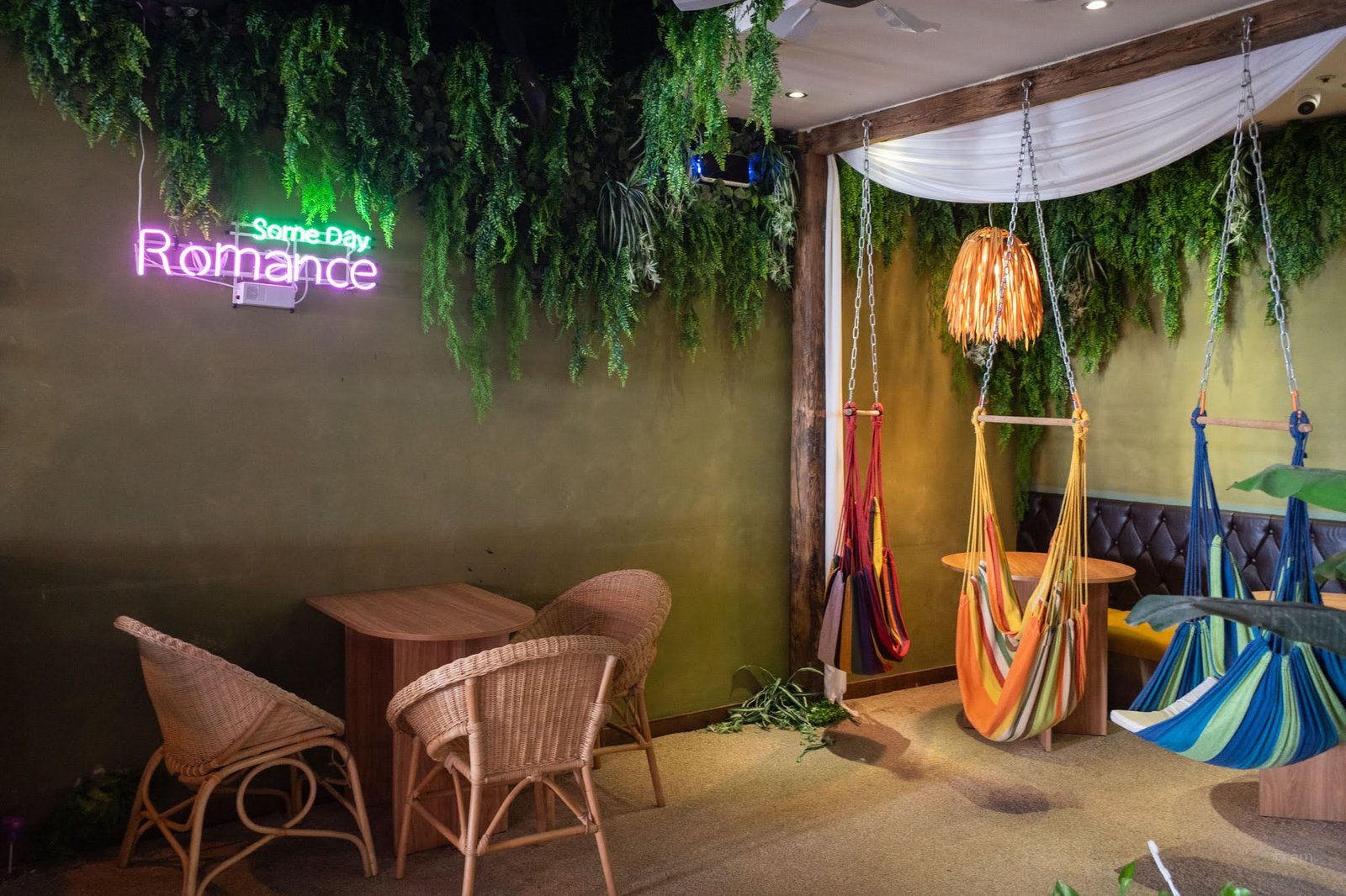 Deeper inside, a dimmer room breaks entirely from the daytime brightness of the courtyard — olive-green walls, cascading artificial ferns, and a row of colorful fabric hammocks suspended from timber frames. Orange and blue and multicolor striped, they are the least curated objects in the building, and somehow the most immediately inviting. The whole room feels like a beach shack that has been transplanted indoors and slightly upgraded. The neon sign appears again here, smaller, glowing against the dark wall.