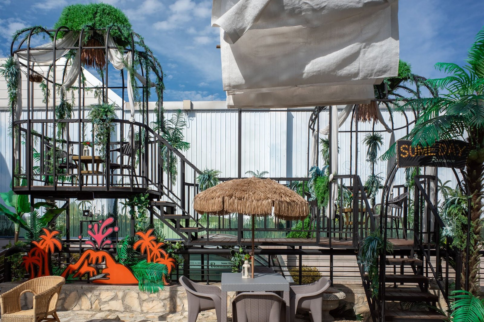 The premise here is pure maximalism: a tropical resort fantasy assembled on the rooftop of Savezone department store in Dunsan-dong, and committed to the concept at every turn. No corner goes understaged. The outdoor courtyard alone contains a two-story iron birdcage tower with a spiral staircase and upper seating; bubble dome tents lined with white drapery; a second carved stone arch rising directly from the water; and enough synthetic and real vegetation to sustain some kind of ecosystem. A small sign reads Sky Lounge. A frog sculpture holds flowers. It is not subtle, and it is not trying to be.