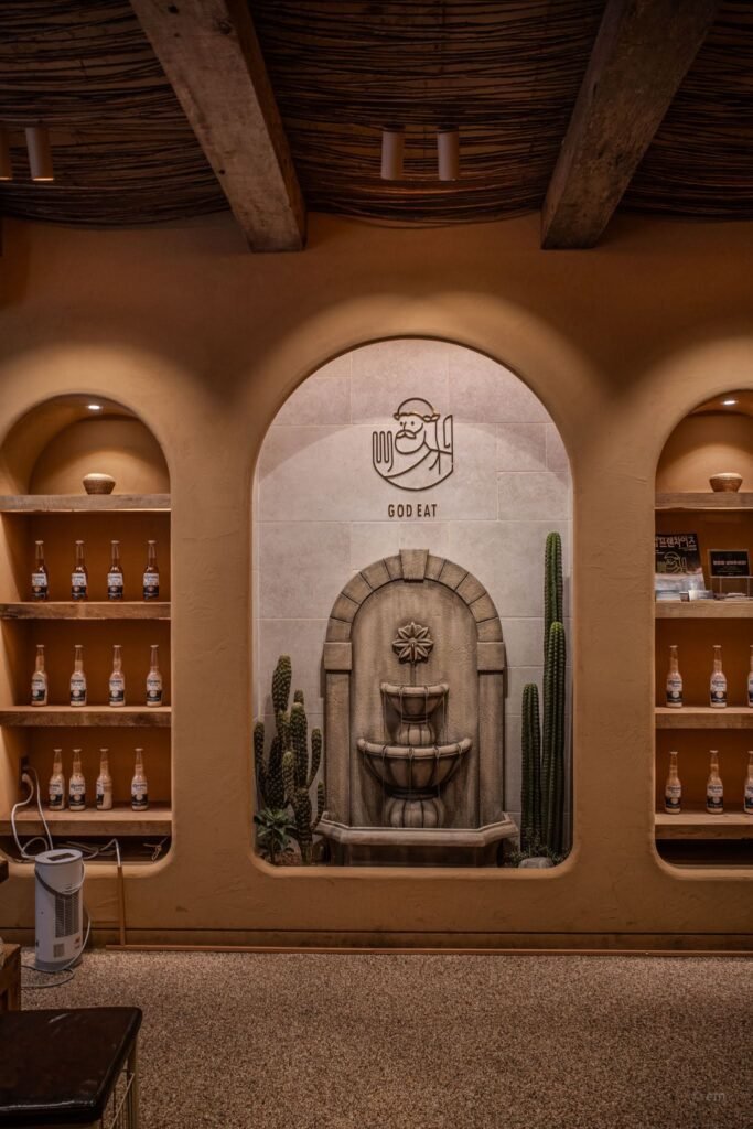 In Korean, holy water is 성수( Seongsu) — 聖水. This neighborhood is Seongsu. This restaurant is Holy Water. The shelves