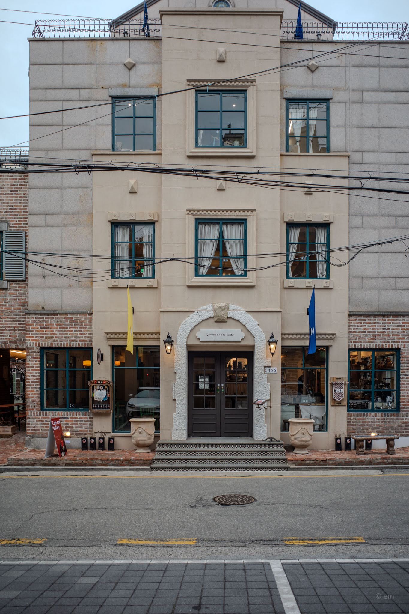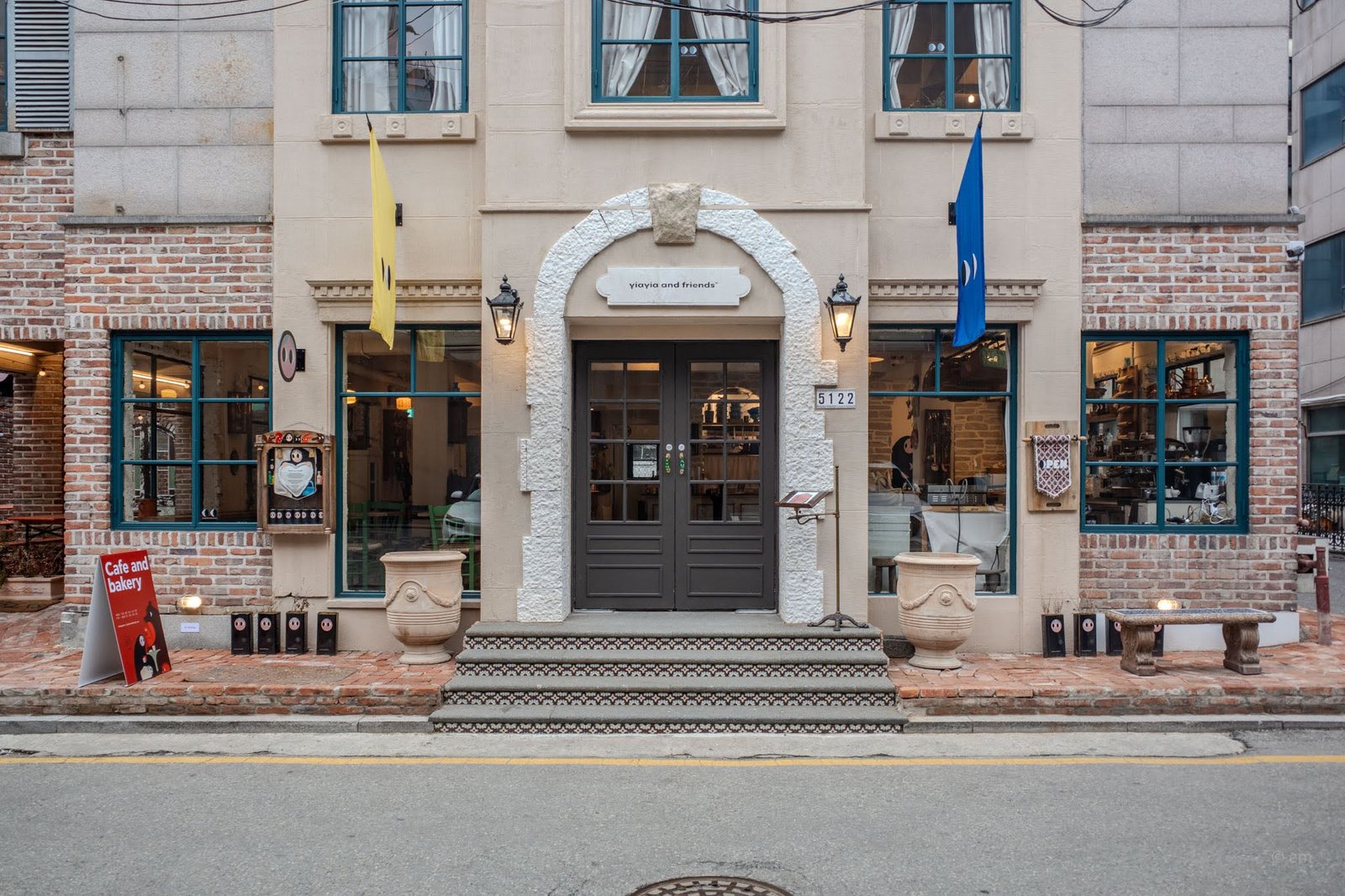 Near the quiet end of a Gangnam alley, a cream stone façade with teal window frames and a white arched doorway announces itself with quiet confidence. No neon. No queue management ropes. Just two terracotta urns flanking the entrance, a yellow flag on one side, blue on the other, and a small brass nameplate that reads yiayia and friends — Greek for grandmother and her circle. Step inside and Seoul largely disappears.