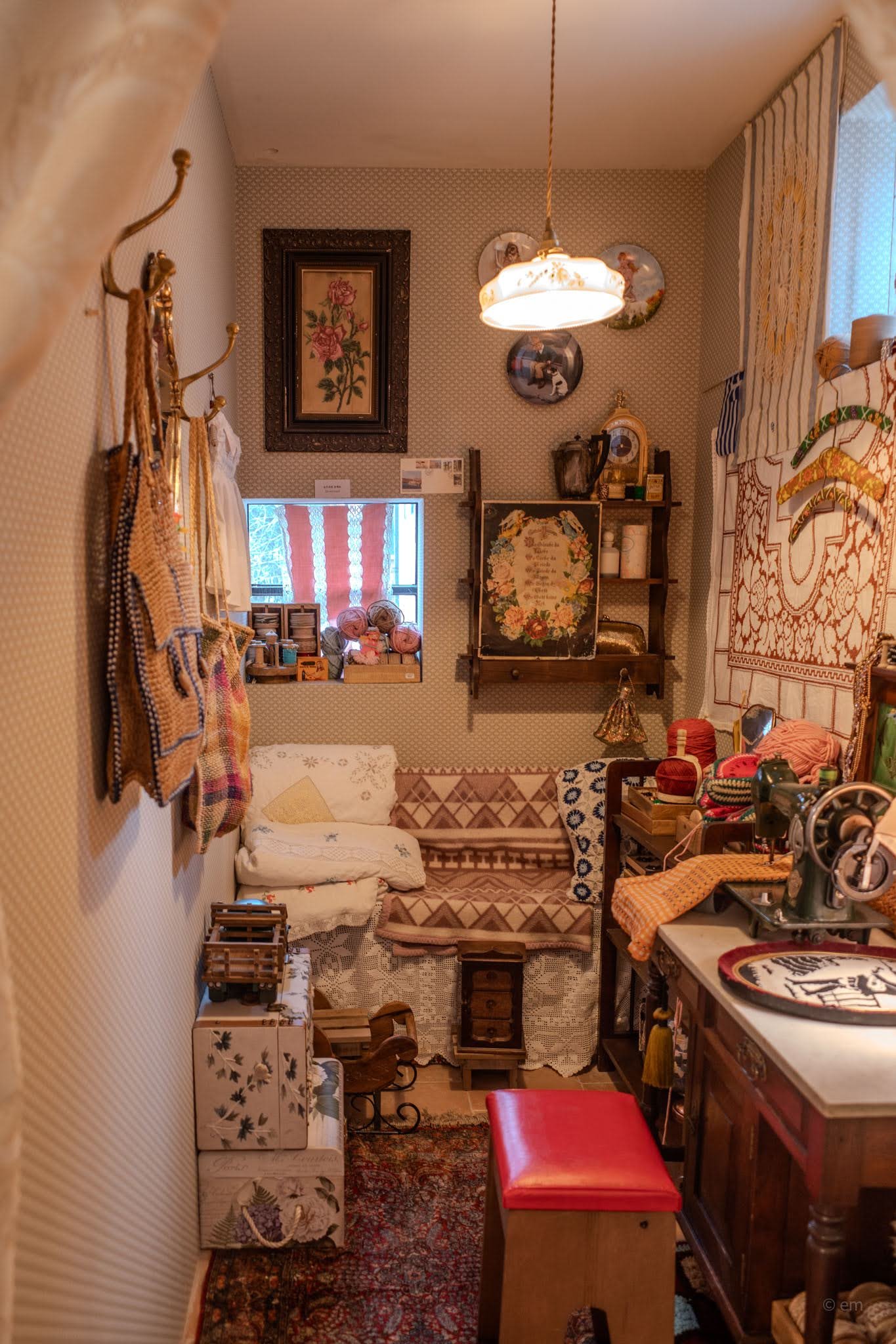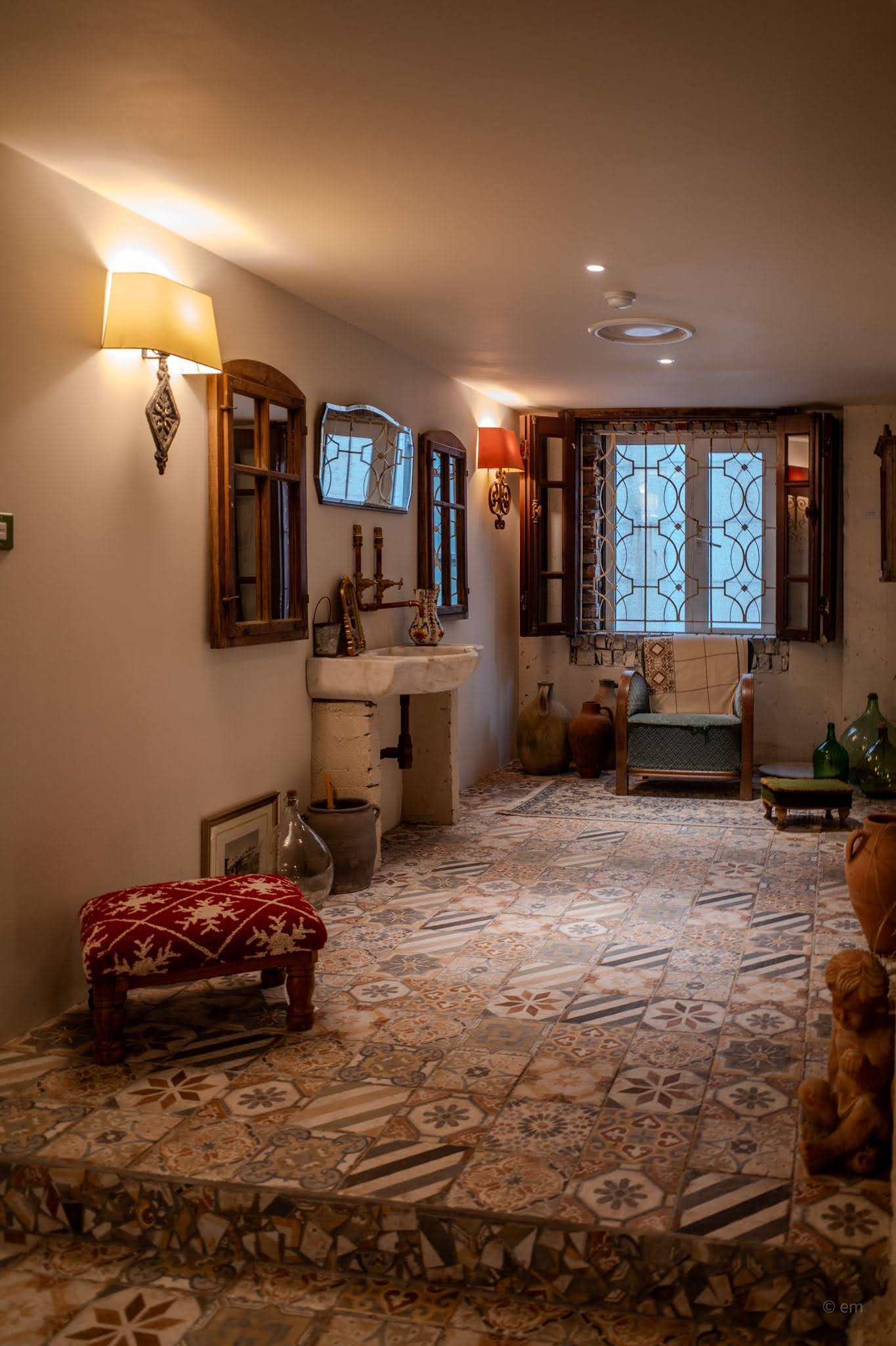 One area reads as a living room: a floral sofa by the window, a low coffee table with mosaic inlay, curtains stirring in the draught. Nearby, a long farm table on painted sage legs stretches across a brick floor, surrounded by mismatched stools, while pendants cast a warm amber circle over the wood. Move further and the floor shifts to a patchwork of encaustic tiles — geometric, floral, faded — and the space narrows into a Mediterranean corridor with a stone pedestal sink, wooden-shuttered windows, and a small red footstool placed at an angle that suggests someone just got up. Past that, white Ionic columns stand on a raised tiled platform beside a gallery wall of Greek island maps, sailing prints, and a Greek flag. Past that, a compact sewing room: floral wallpaper, a treadle machine, yarn spilling from baskets, a porcelain lamp with a gold pull chain. And past that, a kitchen — dense with coloured tile on the back wall, a vintage white stove, shelves packed with enamel pots, crossword clippings, dolls, and copper ladles — a room that has been accumulating things for fifty years and doesn’t intend to stop.
