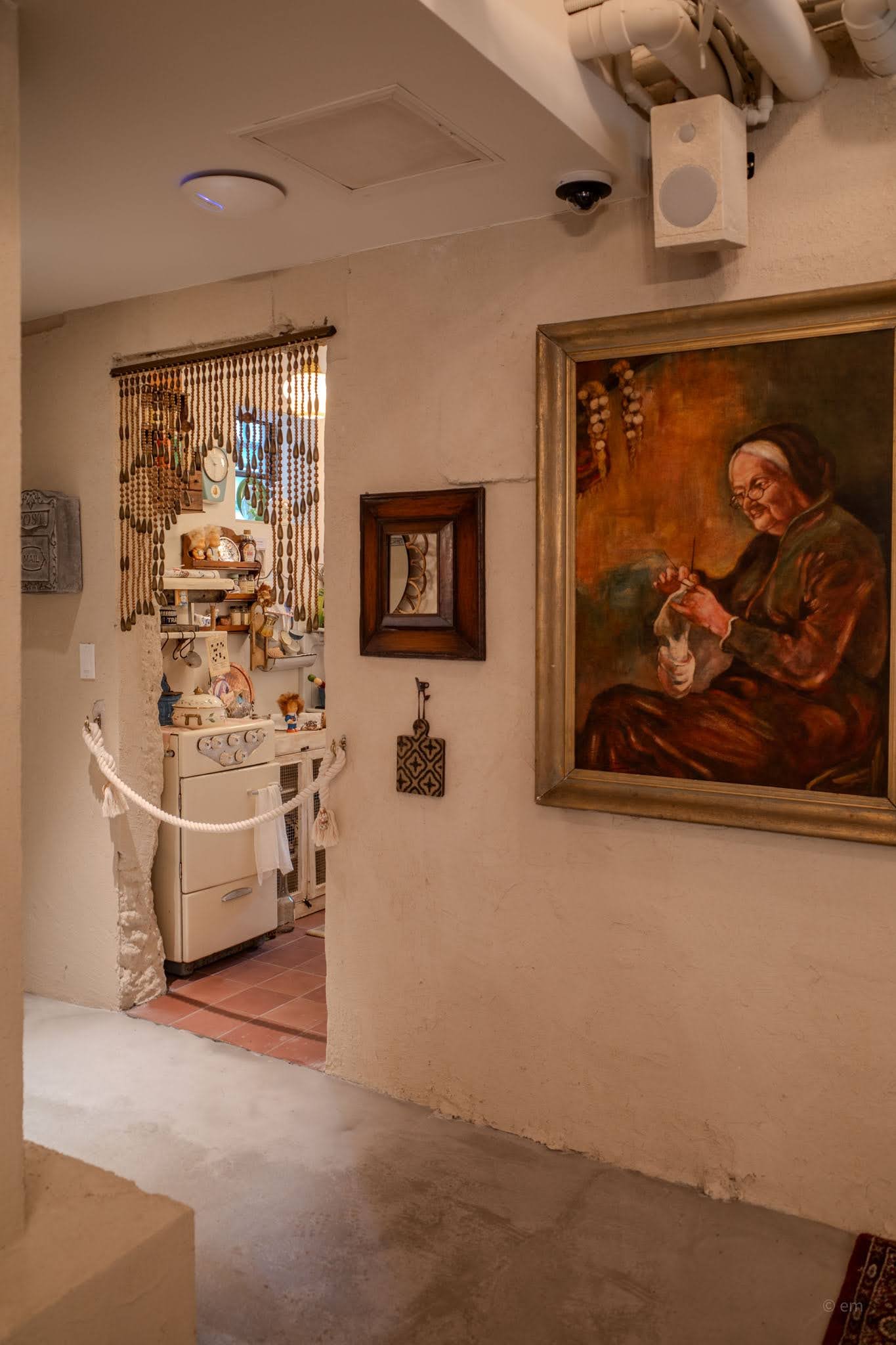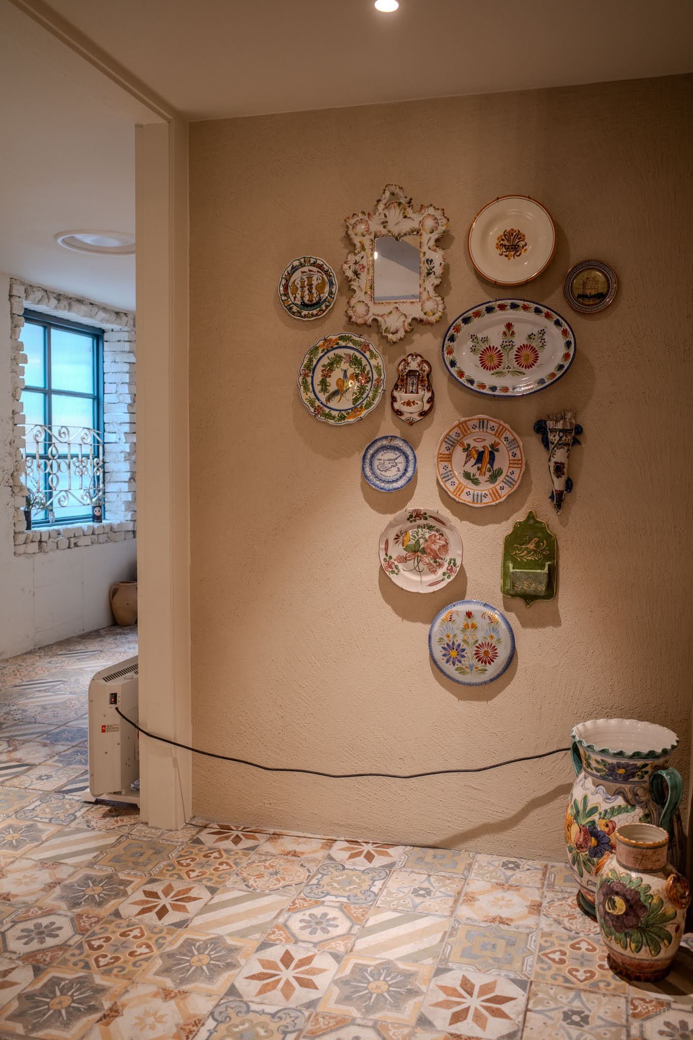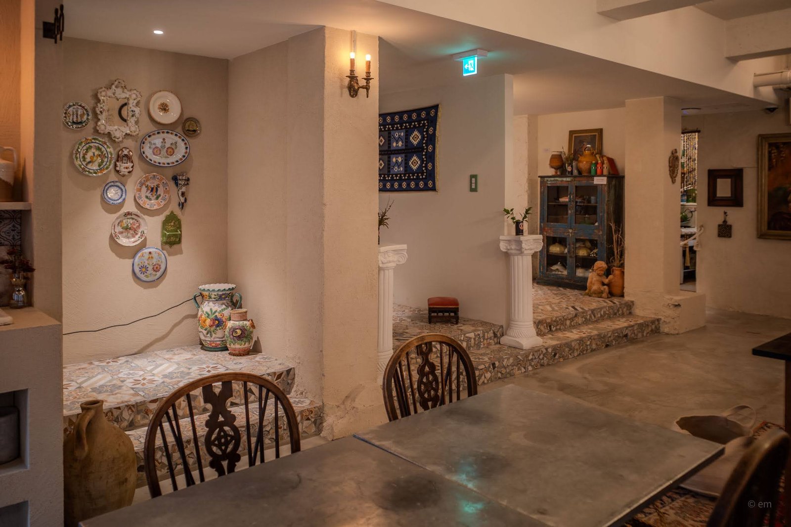The second floor is the main event, and calling it “seating” would be technically accurate and completely misleading. It is a sequence of rooms — or the illusion of rooms — each inhabited with a different personality, all of them orbiting the idea of a Greek grandmother’s estate encountered over decades rather than designed in a single session.