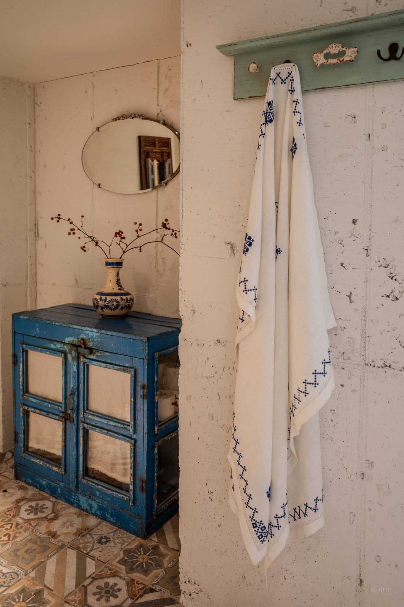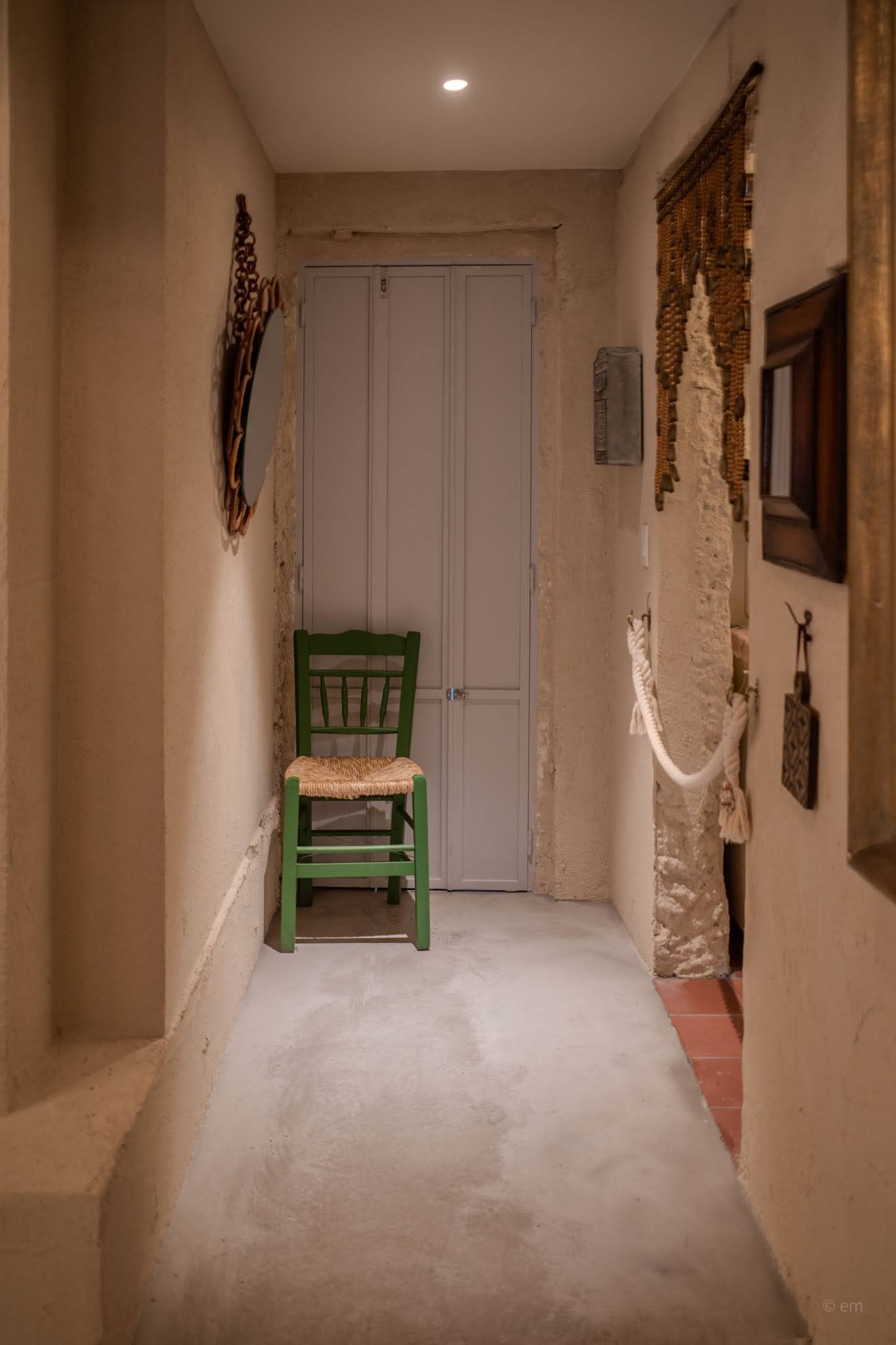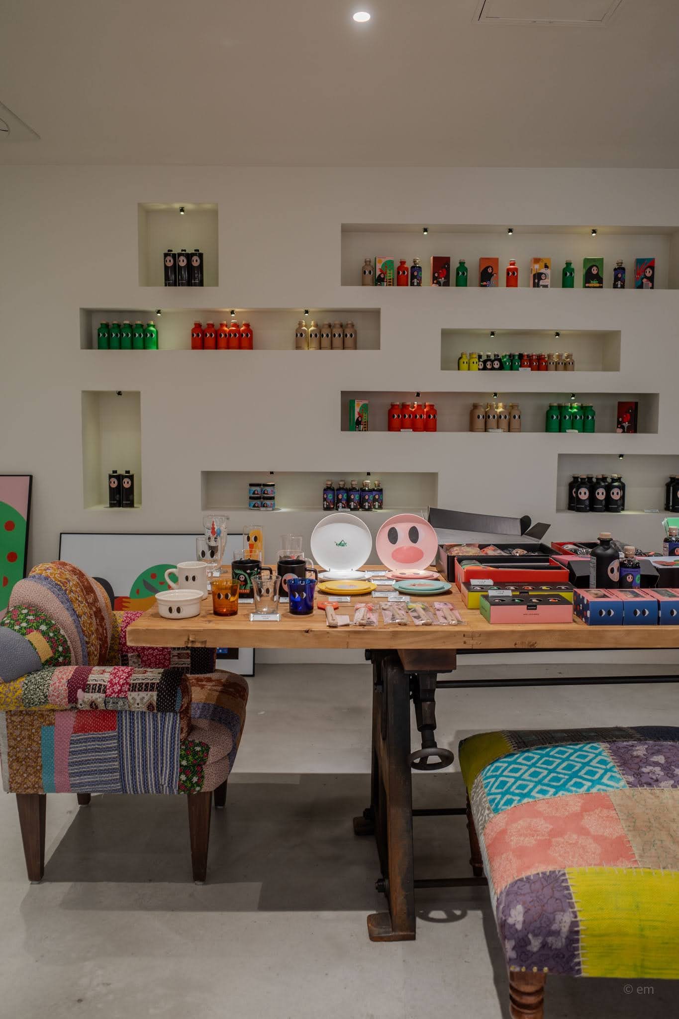 The upper floor transitions to a white gallery space — clean-walled and quietly lit — where the product range is displayed in architectural niches. Olive oil bottles in red, green, black, and ochre stand in rows like a colour chart. Branded ceramics, mugs, and gift boxes are laid across an industrial crank table flanked by patchwork-upholstered chairs. The shift from the accumulated warmth downstairs to this spare brightness is deliberate: the grandmother’s world is below; the design language it inspired is up here.