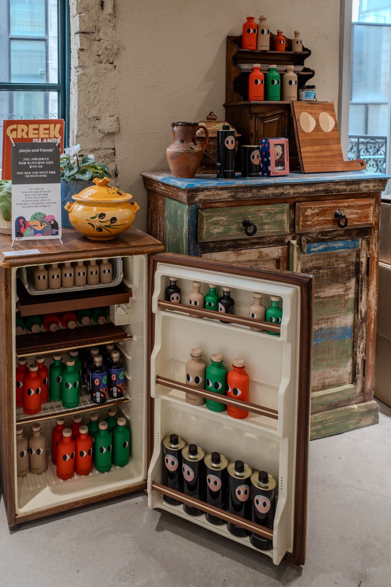 Yiayia and Friends began as something far smaller than this: a family farm on the island of Crete, in the southern Greek archipelago, producing extra-virgin olive oil the old way — handpicked, cold-pressed, from groves tended for generations. The brand grew outward from that single ingredient, accumulating a design language as distinctive as anything in contemporary food retail. Their signature character — a round-headed figure with wide, melancholy eyes — appears on bottles, plates, tote bags, and stickers in a palette somewhere between Bauhaus and fairy tale. The Seoul store opened in October 2023, and with it, the Yiayia universe expanded: new characters, new illustrations, and a physical space large enough to contain an entire imagined world. In 2024, the brand received the Red Dot Award’s “Best of the Best” distinction for packaging illustration — recognition that the olive oil bottles lining their shelves are, in fact, design objects as much as pantry staples.