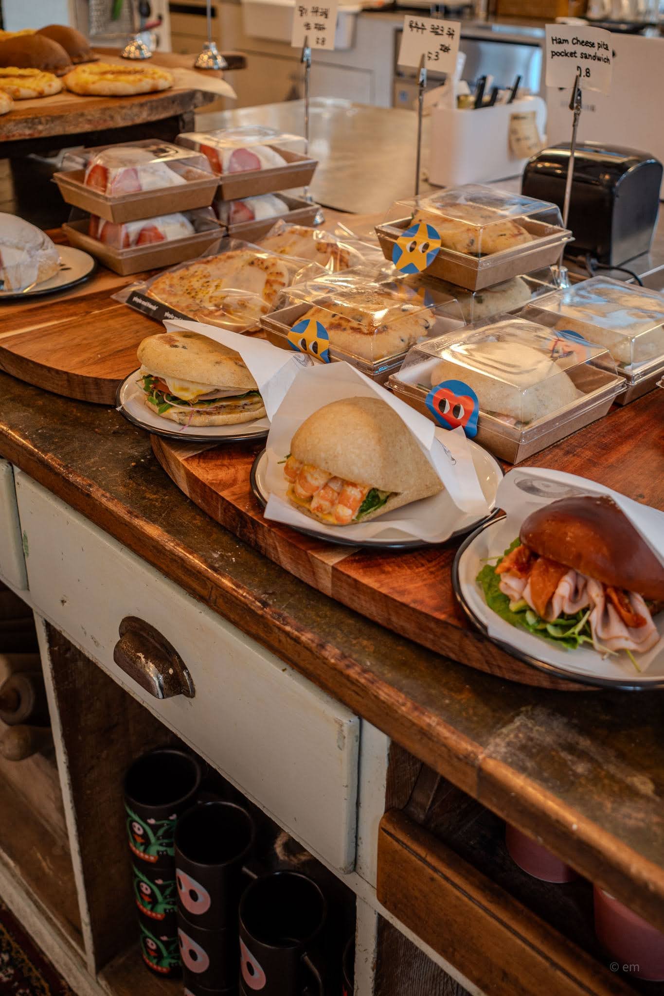 The menu covers coffee, beverages, and a spread of bakery and brunch items including banana bread, caramel croissants, pita bread, and various sandwiches. Pita is a specialty — thick, charred at the edges, stuffed and hand-folded. At the bakery counter, sandwiches are labelled in both Korean and English, and the product shelves beyond the café carry Greek pantry goods alongside the branded olive oils.